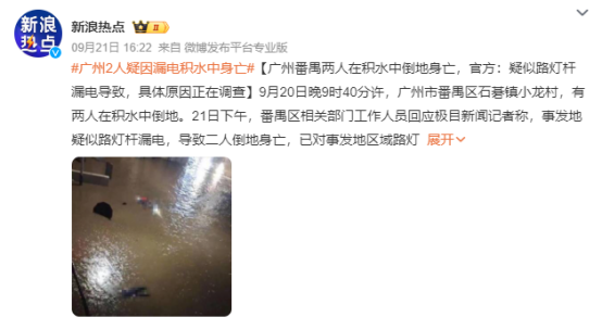 9月20日晚9時40分許,廣州市番禺區石碁鎮小龍村,有兩人在積水中倒地。21日下午,事發地疑似路燈桿漏電,導致二人倒地身亡,已對事發地區域路燈采取臨時斷電處理,事件具體原因正在調查。