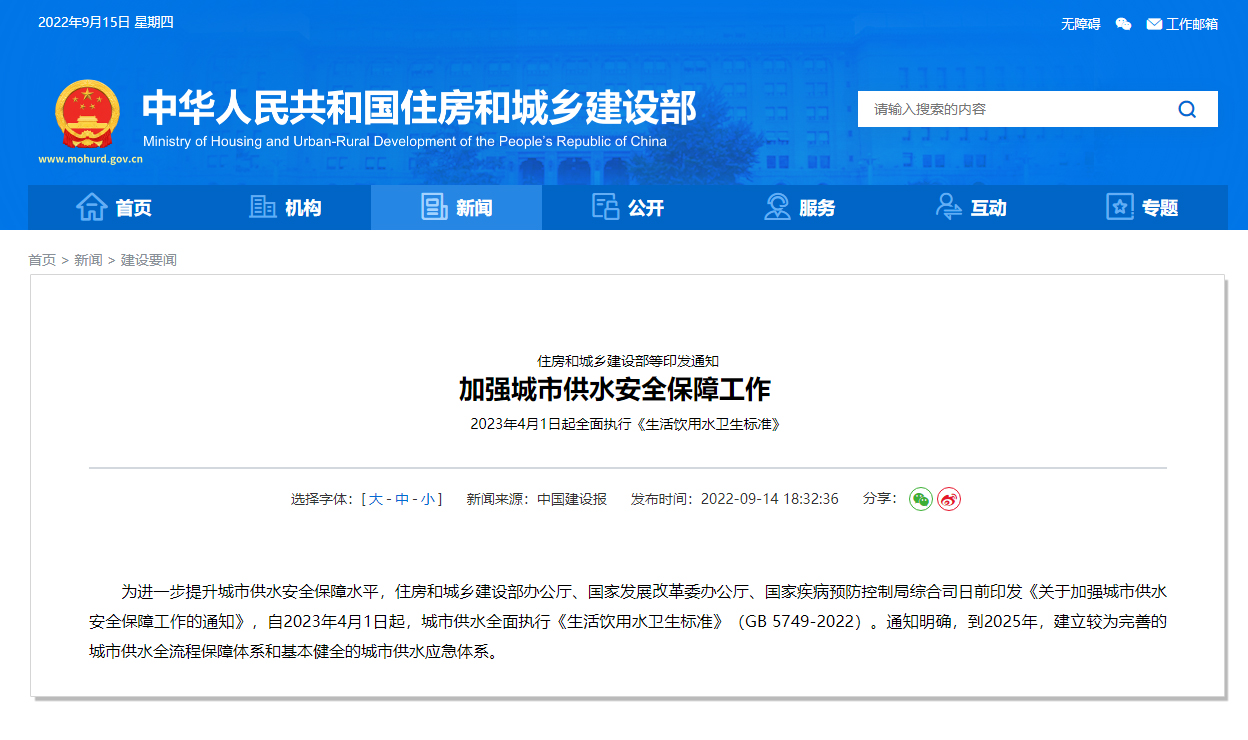 住房和城鄉建設部等3部門聯合印發《關于加強城市供水安全保障工作的通知》